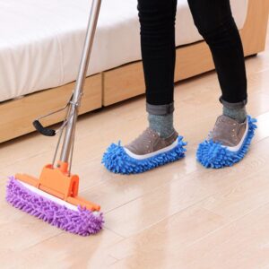 ) micro fabric 2) CONVENIENT& MULTI-PURPOSE: Just wearing this mop slippers makes the whole house beautiful. Can also be set in mop as a mop head, used to wipe floor, wipe glass, or washing the car, etc. 3) HIGH PROPERTY of absorbing water and dust moping with microfiber. 4) FREE SIZE: Both for men and women, adults and kids. Can use it with barefoot or as a shoes cover. 5) COMFORTABLE: Soft and non-slip mop slippers, giving best experience in household cleaning. 6) PERFECT FOR dust, dirt, and pet hair, this dust mop slippers is a great time saver. simply wash and reuse over and over.